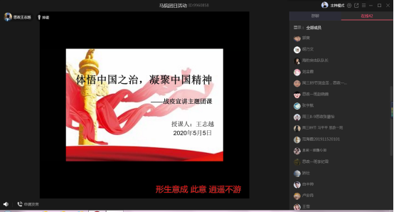 在团支部引领带动下,支部全体同学认真学习青年大学习网上主题团课,开展了以“体悟中国之治,凝聚中国精神”为主题的战疫宣讲主题团课活动。团支部副书记王志越利用群课堂的形式与同学们分享了人民日报最新发文,对比了中国与其他国家抗击疫情的行动力与效果区别,并通过丰富的案例进行,启发引导广大同学们对中国特色社会主义制度优势的深刻理解,自觉坚定“四个自信”,做一名坚定的马克思主义接班人。