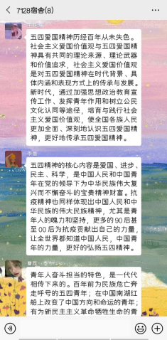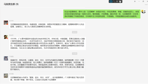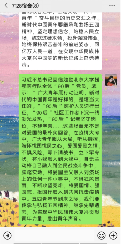 同学们认真学习了习近平总书记给北京大学援鄂医疗队全体“90后”党员的回信,组织委员梁梦洁录制了“疫情防线上的青年战斗者”宣讲视频,通过对武汉隔离病区的青年志愿者90后小伙“大连”事迹的介绍,用榜样的力量和精神启迪大家用行动践行使命,在祖国最需要的地方绽放青春之花。同学们以学习小组为单位,结合“爱国、进步、民主、科学”的五四精神,在线上积极展开热烈讨论。大家纷纷表态会以新冠肺炎疫情防控中的青年楷模为榜样,更加紧密地团结在以习近平同志为核心的党中央周围,勇挑青年使命,勇担时代担当,做中国特色社会主义事业的建设者和接班人。