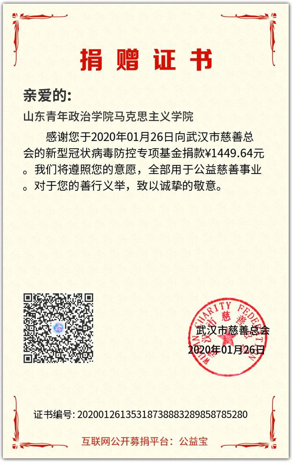 本次爱心捐款活动得到全班同学的积极响应,同学们心系武汉,量力而行,在自己能力范围内参与此次捐款,截止到26日下午,共筹集到善款1449.64元,在第一时间全部捐至武汉市慈善总会,为武汉疫情尽上一份微薄之力。