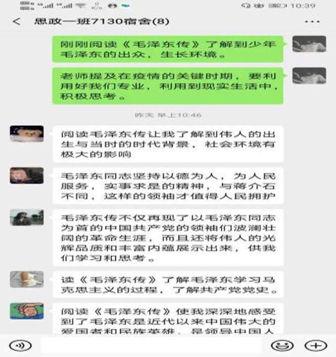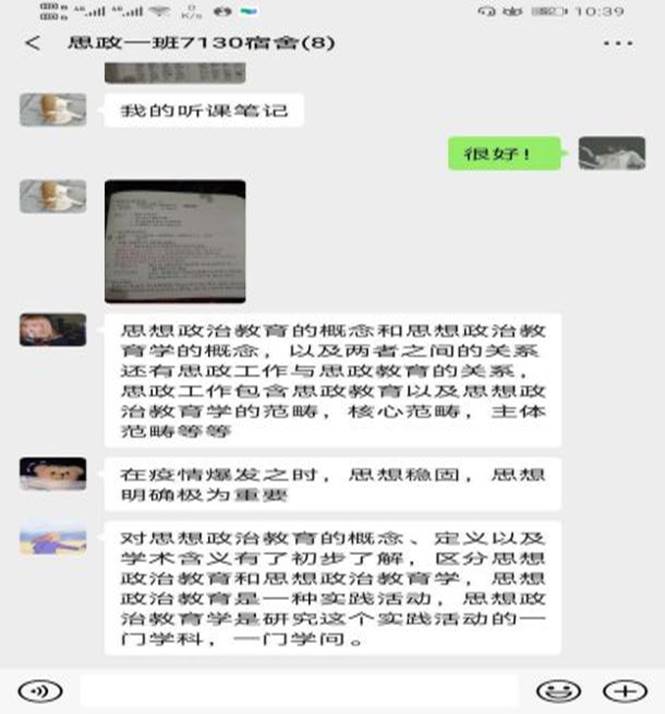 受到老师们的勉励支持,学生干部争做表率,根据学院发布的居家学习方案进行深入探讨,制定促进班级学习进步的方案。在引导同学们组成学习小组,一同分享读书心得与学习经验的同时,鼓励大家就每日课程的内容进行讨论,互相学习,温故知新,共同钻研疑难点,并向老师请教。同学们居家隔离期间学习热情不减、学习劲头不松,通过网络桥梁畅游书海,追赶学习进度,营造了浓厚的学习氛围。