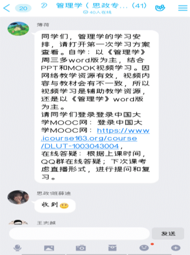 在学院的统筹安排下,各科老师根据学科特点,灵活调整教学计划,合理选择视频、电子书等教学资源,指导学生下载学习通、中国大学MOOC、爱课程等网络教学资源平台,每周制定小作业,确保“停课不停学”的质量实效,确保在线教学不少一课、不落一人。对于在线教学出现的问题,老师们通过微信、QQ、云班课等建立群聊,与同学们进行亲切沟通,分享个人读书心得,讨论新闻,介绍学习方法,明确新学期学习目标。师生之间的良性互动激发了学生学习的积极性,让大家感受到了关心和爱护,尽管不能在同一间教室听课,但各位老师“家教式”的辅导和不厌其烦的解答令同学们倍感幸福,更有了不一样的收获。