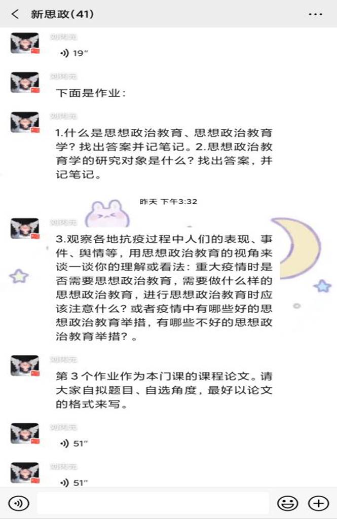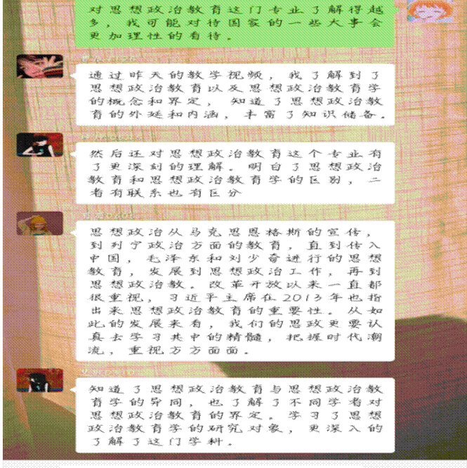 特别是,很多老师针对思想政治教育的专业学科特点,教授知识点的同时,更加注重结合社会热点提高思辨能力。例如引导学生从专业角度看待此次新冠肺炎疫情,带领同学们思考社会问题,鼓励大家担负起思政人的使命与责任,提出马院思政青年的独到见解,发出青年声音。