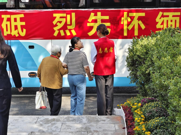 活动当天,志愿者们神情庄重、纪律严明,怀着对英烈的无限崇敬投入服务工作。在历城革命烈士陵园,当烈士亲属抵达时,志愿者们迅速有序地上前对接,实行“一对一”全程陪伴。他们小心翼翼地搀扶年长亲属,以温和的话语耐心引导烈属缓缓步入安葬区。在祭奠过程中,志愿者肃立于烈属身侧,协助完成献花、默哀等仪式,主动讲述他们所了解的烈士事迹,以真情抚慰烈属的哀思。祭奠结束后,志愿者们继续陪同烈属来到纪念馆,缓缓穿行于展陈之间,志愿者们成为倾听者与讲述者,细心回答烈属们的询问,讲述他们的缅怀之情。