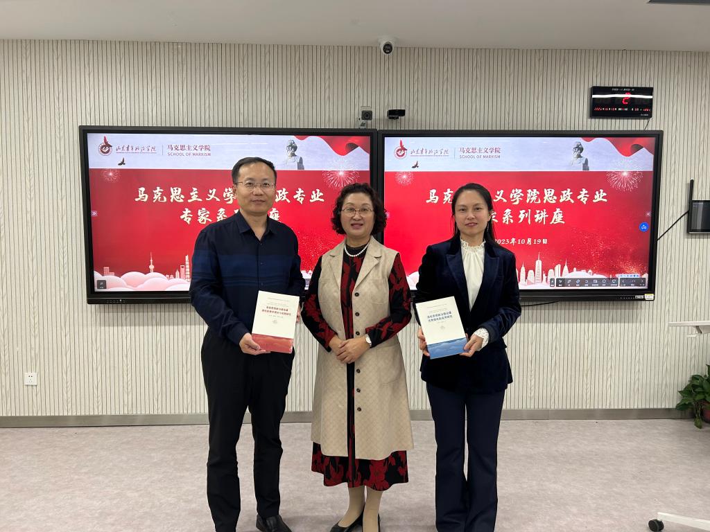 最后,柴素芳教授向我院赠送《高校思想政治理论课微电影教学理论与实践研究》和《高校思想政治理论课优秀微电影应用研究》等河北大学思想政治理论课微电影教学成果丛书。我院教师王海彬就此次讲座作总结,他表示,柴教授的讲座令大家收获颇丰,我们要学习柴教授的思政课实践教学模式,使思政课堂更加突出学生的主体地位,发挥好教师的主导作用,运用微电影等实践教学形式使思政课内容入眼、入耳、入心,共建精彩“大思政课”,打造实践育人新篇章。