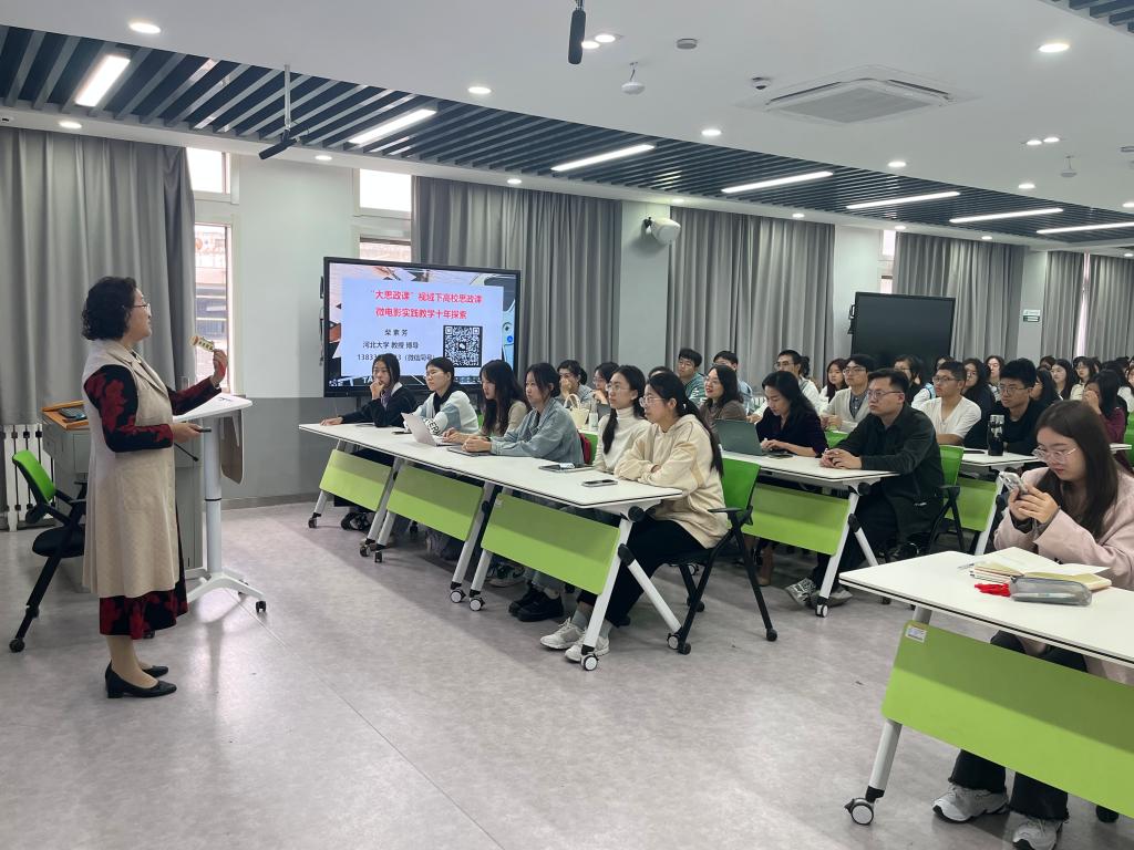 柴素芳教授从“思想政治理论课社会实践”课的开课背景、课程目标、发展历程、解决问题、教学环节、实践要求、实践成果和发展前景等方面,介绍探索思政课实践教学微电影创作的改革历程和成功经验,并同师生观看其指导的“我心中的思政课”第六届全国高校大学生微电影展示活动二等奖作品《西淀灯火》,分享了此作品的创作理念、拍摄过程及实践收获,分析了在新时代推进思想政治理论课改革发展的背景下“大思政课”的多重内涵,并向大家分享了河北大学微电影教学改革中的成果经验。她指出,编写剧本、拍摄电影本身就是学习思政课的过程,要让学生在教育过程中实现角色转换,变单向灌输为平等对话,将思政小课堂与社会大课堂结合起来,实现理论上的学习和实践成长的有机结合,以微电影为载体实现思政课“立德树人”的目标。柴教授的讲座引发了在场师生的共鸣,反响热烈,现场师生深有感触,并就思政课微电影实践教学相关问题展开互动交流。