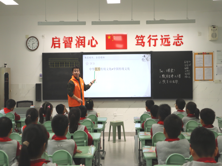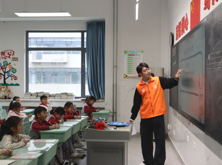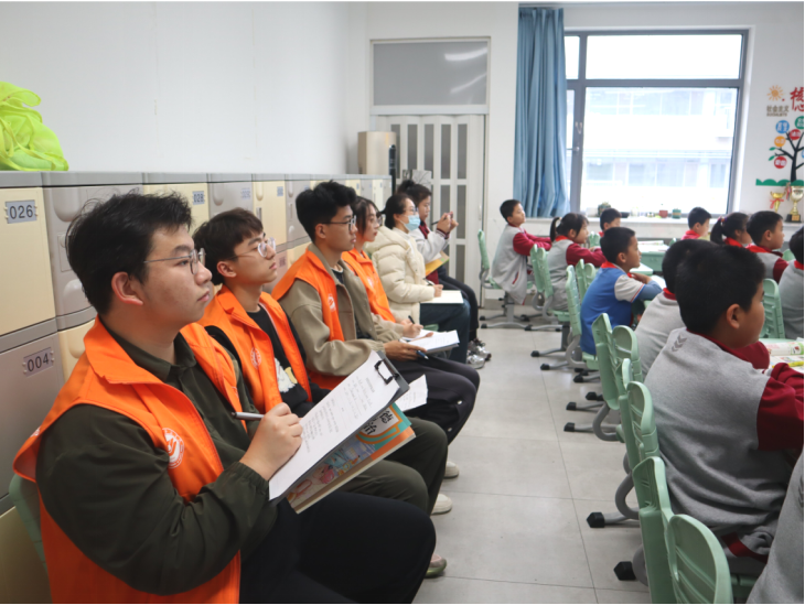 活动开始前,师生深入小学课堂,聆听一线教师的现场课,进一步掌握小学课堂特点。随后,青荟理论宣讲团的14位学生宣讲成员面向7个班级的300名小学生开展宣讲,用童言童语阐述理论,以生动故事浸润童心,将习近平新时代中国特色社会主义思想融入生动实践教学。