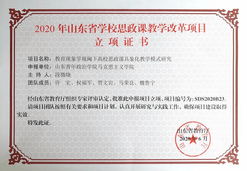 近日,山东省教育厅发文公布了2020年省学校思政课教学改革项目立项名单,段微晓主持的《教育现象学视阈下高校思政课具象化教学模式研究》获批立项。